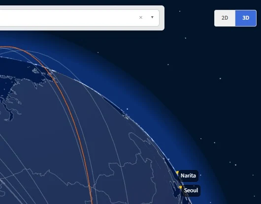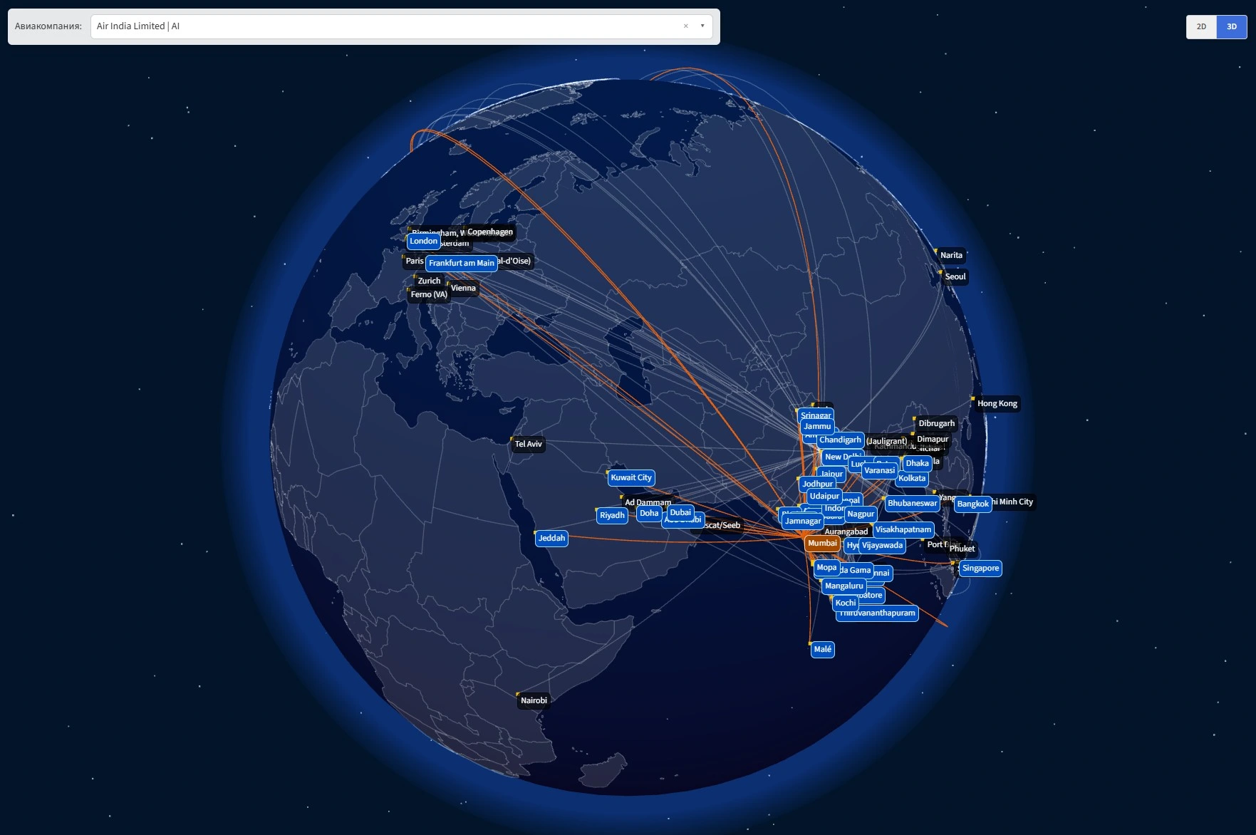 3D-режим добавляет принципиально другой способ восприятия маршрутных сетей: видно, как трансатлантические маршруты дугой уходят через север, насколько плотно покрыта Европа, где расположены хабы относительно друг друга. При этом технически это отдельный, изолированный модуль — 2D-режим продолжает работать независимо.