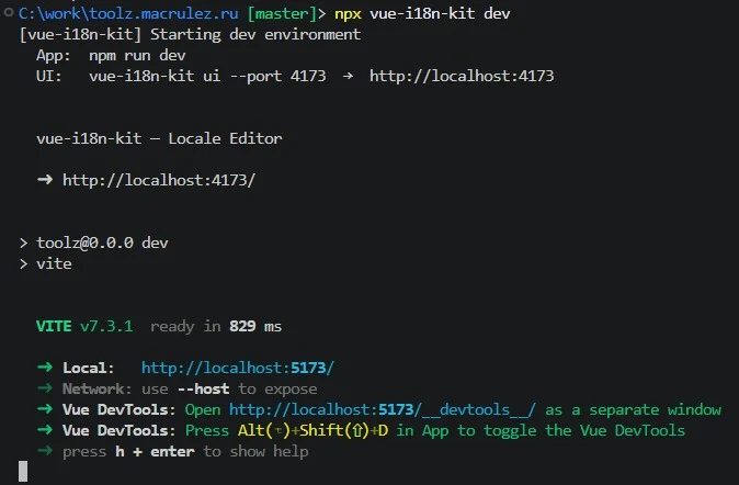 Чтобы in-context editing работал, нужно запустить два процесса параллельно: dev-сервер приложения и vue-i18n-kit ui. Это две вкладки терминала, что немного неудобно.