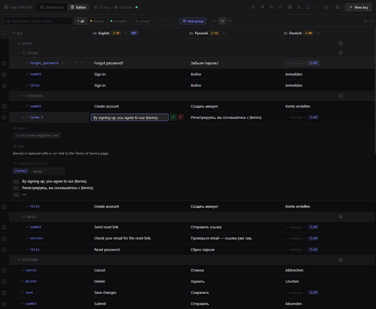 vue-i18n-kit: Locale Editor UI — дашборд, группы ключей и валидация