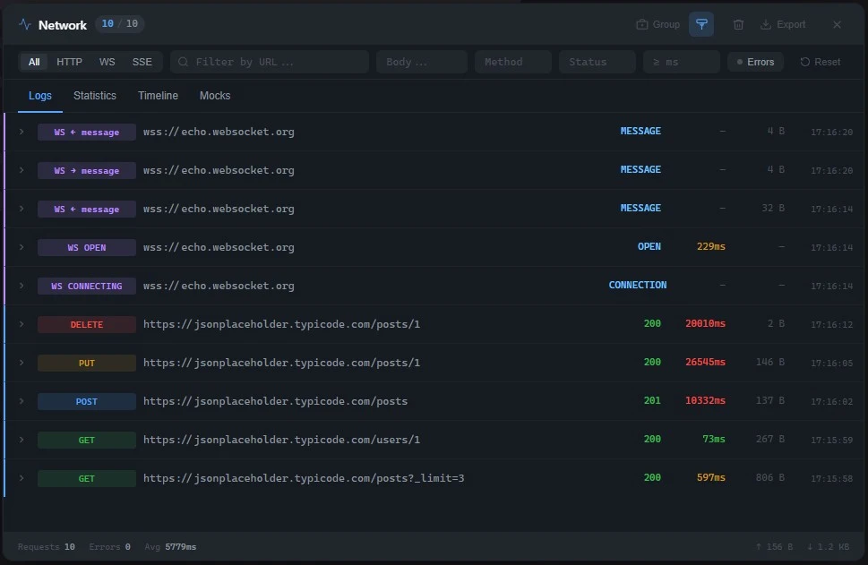 DevTools справляются, но у них есть неудобство: ты постоянно переключаешься между вкладкой приложения и вкладкой Network, теряешь контекст, ищешь нужный запрос в общем потоке. Если приложение работает с WebSocket или SSE — всё становится ещё хуже.