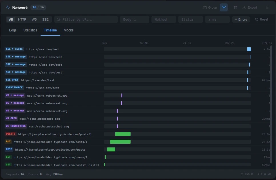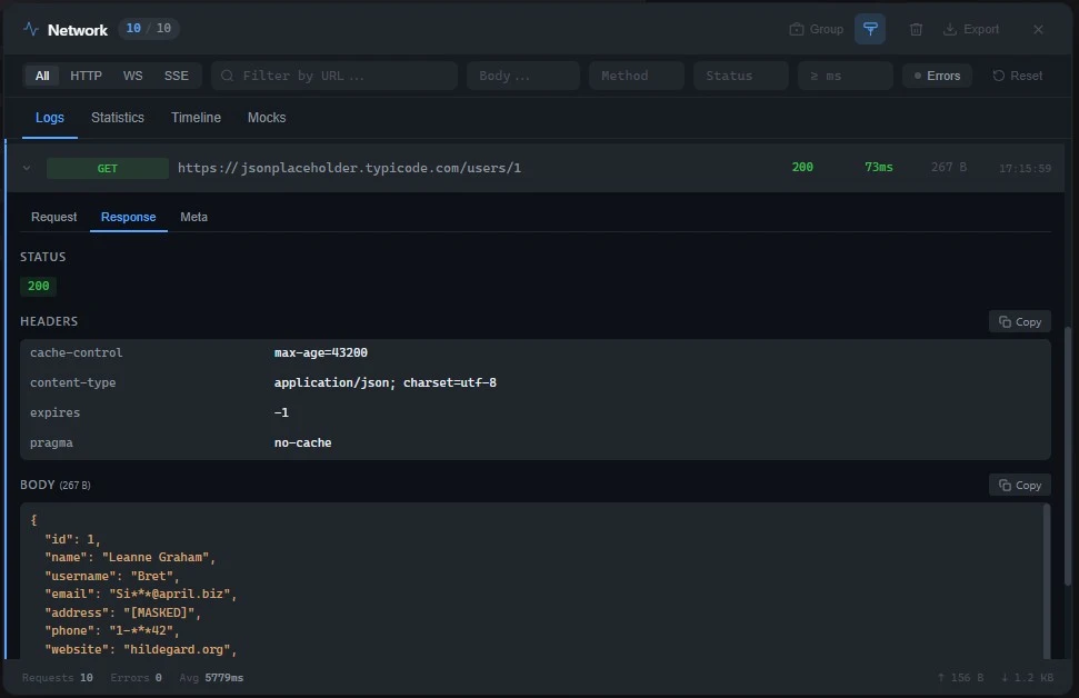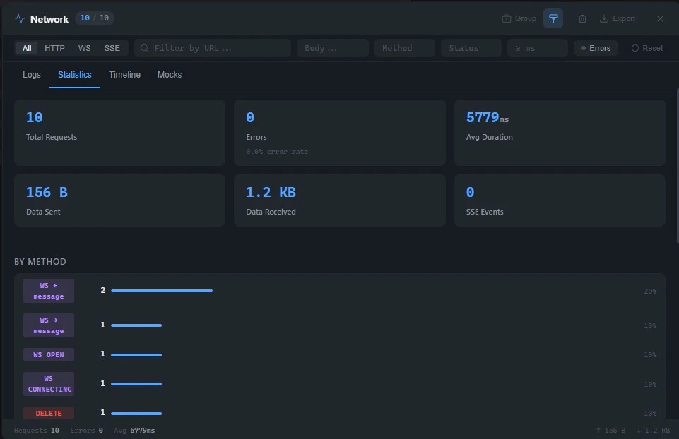Всё. С этого момента все Fetch, XHR, WebSocket и SSE запросы перехватываются. Можно добавить компонент панели в App.vue: