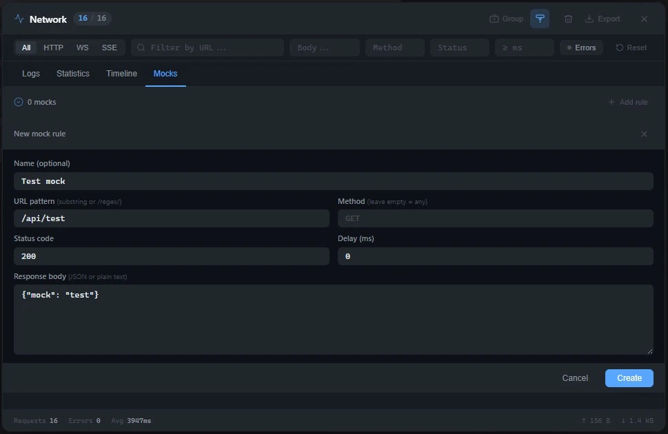 Можно определить правила-перехватчики: по URL и методу подменить ответ — задать статус, тело, задержку — не трогая бэкенд. Правила можно создавать прямо из UI панели или программно в коде. Замоканные запросы логируются как обычно, но с отдельным бейджем mock, чтобы не перепутать с реальными.